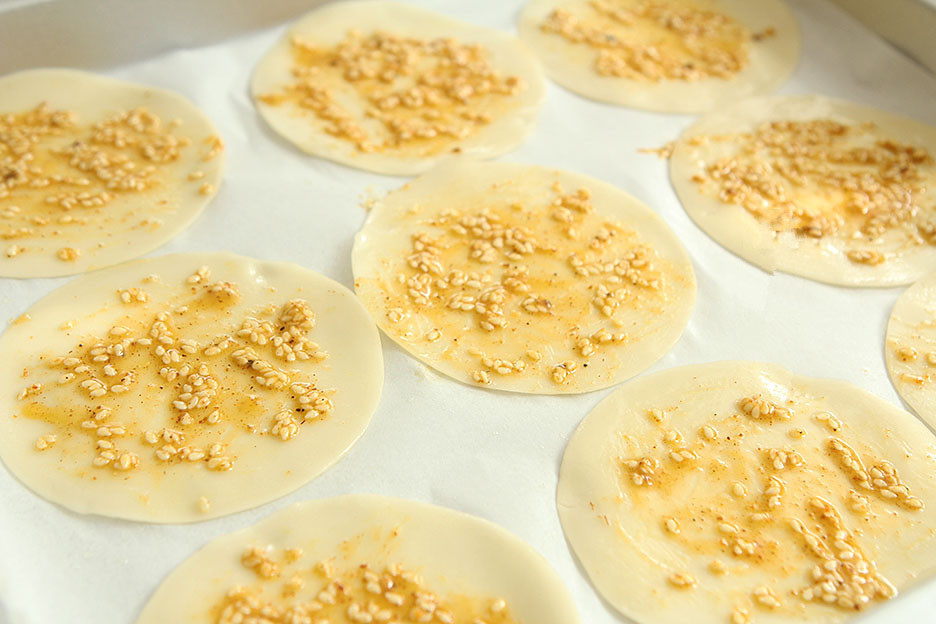3、烤盘内铺好油纸,把饺子皮摆好在上面;