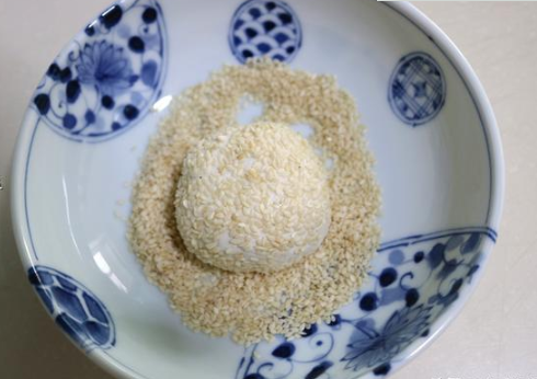 6,搓圆后的糯米面团表面非常湿润,直接放入白芝麻中滚一圈,表面就裹满了芝麻,然后放在手心再搓圆,使芝麻粘得更牢固。