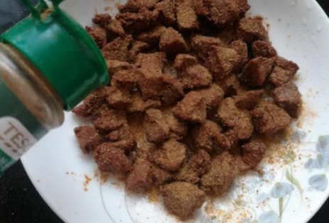 7、里脊肉从锅中捞出,均匀地撒上孜然粉,让所有的猪肉粒都被撒到。烤箱提前十分钟预热,将猪肉粒放在烤盘中。