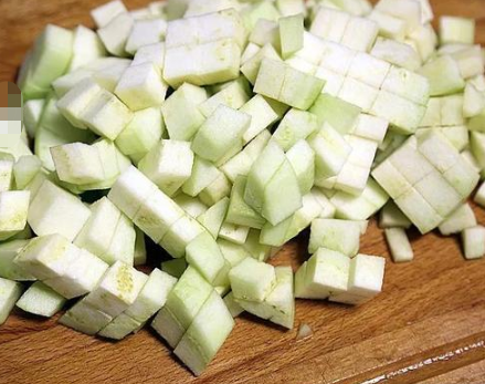 第四步:开始做馅。把茄子去皮后切成小块,如图。