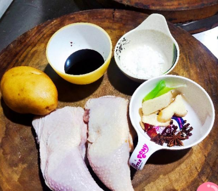 食材:鸡腿2个、土豆1个、花椒6-8粒、八角2个、生姜片、大葱段、蒜瓣2个、料酒、干辣椒2个、盐、生抽、老抽、白糖、香油