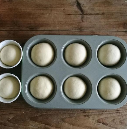 3. 面团发酵好后我们需要从容器中取出,均匀的分为8份,然后揉搓成圆球状继续醒上20分钟。