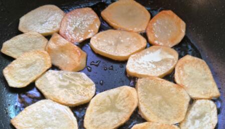 莲藕也用同样的方法,浸泡去水后煎至八成熟捞起备用。